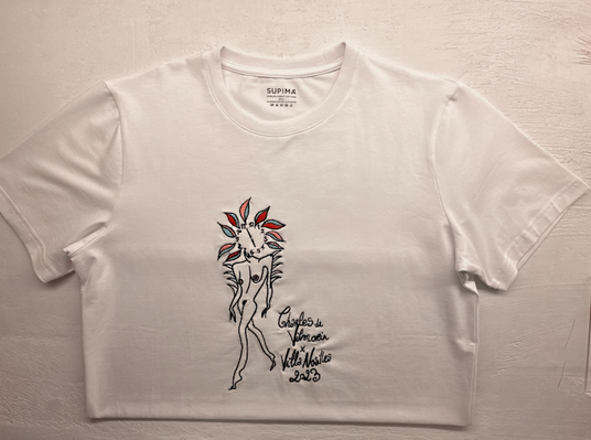 Tee-shirt brodé réalisé par Charles de Vilmorin, président du jury mode du 38e festival de mode, de photographie et d'accessoires 2023.