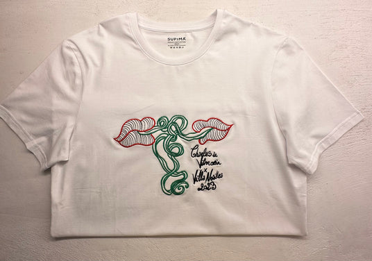 Tee-shirt brodé réalisé par Charles de Vilmorin, président du jury mode du 38e festival de mode, de photographie et d'accessoires 2023.